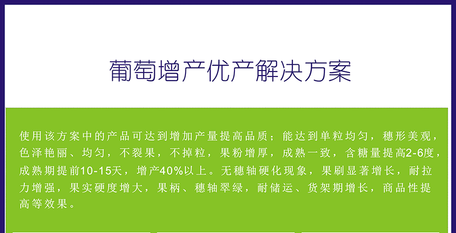 使用該方案中的產(chǎn)品可達(dá)到增加產(chǎn)量提高品質(zhì);能達(dá)到單粒均勻,穗形美觀,色澤艷麗、均勻,不裂果,不掉粒,果粉增厚,成熟一致,含糖量提高2-6度,成熟期提前10-15天,增產(chǎn)40%以上。無(wú)穗軸硬化現(xiàn)象,果刷顯著增長(zhǎng),耐拉力增強(qiáng),果實(shí)硬度增大,果柄、穗軸翠綠,耐儲(chǔ)運(yùn)、貨架期增長(zhǎng),商品性提高等效果。
