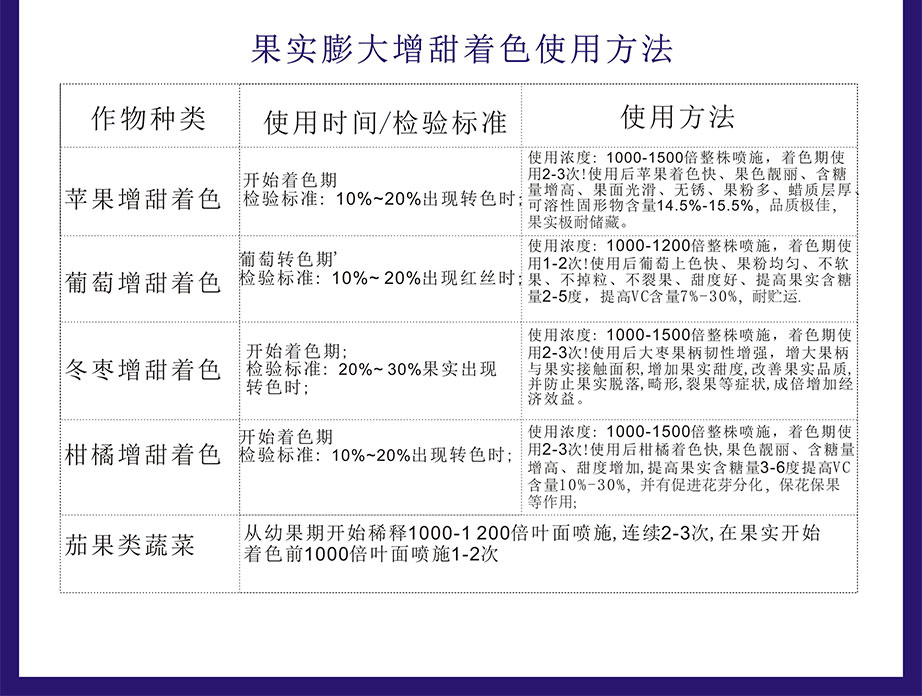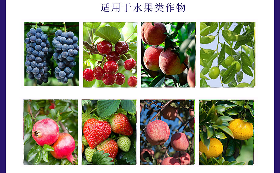 主要針對(duì)水果類作物蘋果、柑橘、葡萄、桃、石榴、大棗、草莓、櫻桃等水果增產(chǎn)優(yōu)產(chǎn)解決方案,,目前市場(chǎng)上的此類產(chǎn)品琳瑯滿目,不能解決水果生長(zhǎng)中出現(xiàn)的果個(gè)小而不均勻,果面不光滑,果銹增多,著色不均勻,口感不好,失去了果實(shí)原有的味道,本方案中的產(chǎn)品是以活化酯、琥珀酮酸、茉莉酮酸、吲哚乙酸、油菜素內(nèi)酯、吲哚丁酸、水楊酸八種天然植物內(nèi)源物質(zhì)合成。可使果樹樹體健壯,果實(shí)增大,果面光潔,上色快而均勻,快速形成果霜保護(hù)膜,增加果皮韌性,預(yù)防果銹。提高維生素C(VC)含量7%-30%,降低有機(jī)酸含量6%-28%,提高糖度2-4度;果香味純,提前上市,延長(zhǎng)果品儲(chǔ)存保鮮期。長(zhǎng)期使用可有平衡樹體生長(zhǎng),緩解果樹大小年等效果。