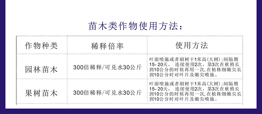 果樹苗木:蘋果、梨、桃、葡萄、柑橘、枇杷、荔枝、芒果、香蕉、臍橙、石榴、獼猴桃、杏、櫻桃、李子、棗、桃樹等等苗木生長過程中出現(xiàn)的死苗、爛苗、僵苗、生長速度慢或只長高度不長粗度等現(xiàn)象的解決方案。本方案中的產(chǎn)品苗木速長劑打破了樹體細(xì)胞分裂原始生長規(guī)律,激活細(xì)胞促使其快速擴(kuò)散分裂,并提高苗木對(duì)水肥的吸收和利用轉(zhuǎn)化能力,促使苗木健壯快速生長,使用后根系發(fā)達(dá),須根明顯增多,吸收能力加快,葉片翠綠,高度粗度比沒有使用本品的增加30%—50%(使用本品10天左右可以看到明顯效果)??s短苗木生長年限、周期、可使苗木提前嫁接提前出圃上市,大大提高了苗木的商品經(jīng)濟(jì)價(jià)值。