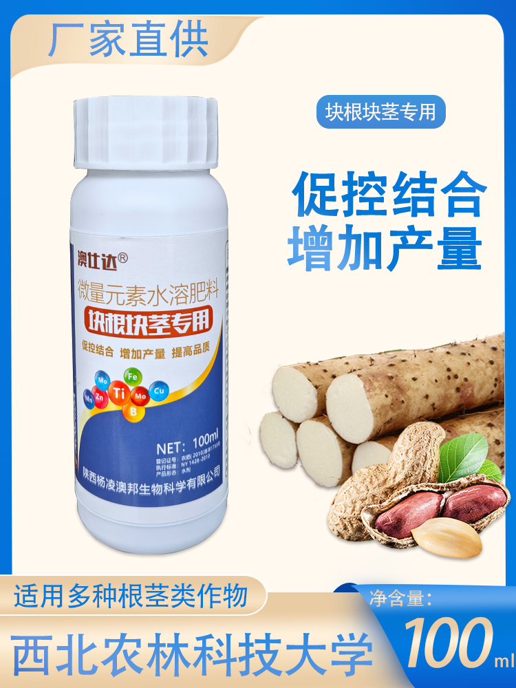 本產(chǎn)品是西北農(nóng)林科技大學(xué)研制的一種新型根莖類作物營(yíng)養(yǎng)調(diào)控劑。本品根據(jù)塊根、鱗、球莖作物的生理、生物學(xué)性能,選用多種植物生長(zhǎng)和化控物質(zhì),有效調(diào)控植物內(nèi)源激素平衡,控制植物秧蔓徒長(zhǎng),提高單位葉片的光合作用能力和根系對(duì)營(yíng)養(yǎng)的吸收能力,促進(jìn)營(yíng)養(yǎng)物質(zhì)向根莖等貯能器官輸送積累,加速根莖的細(xì)胞分裂等作用。