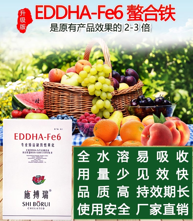 4、施博瑞牌EDDHA-Fe螯合鐵安全可靠、緩釋性好、持效期長(zhǎng):施用量少、增產(chǎn)效率高等特點(diǎn),不含有害雜質(zhì)與激素,對(duì)作物安全無(wú)害。徹底矯治果樹(shù)、蔬菜、毛豆、花卉、園藝作物因缺鐵引起的“黃葉病”、“小葉病”、“白葉病”、“頂枯”、“梢杜”等生理病害。