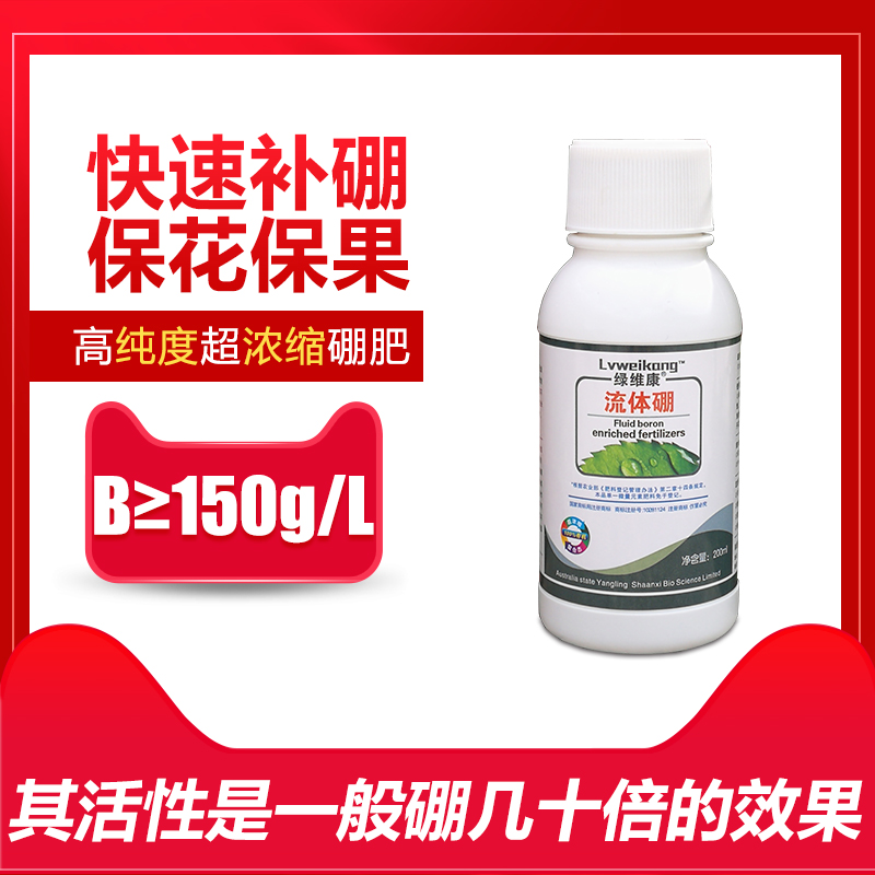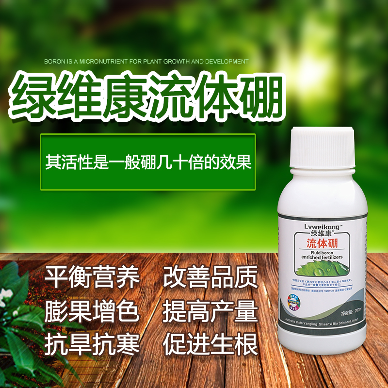 綠維康流體硼是一種高純度濃縮硼肥(B≥150g/L),速溶于水。還特別添加了高效農用有機硅助劑,其活性是一般硼幾十倍的效果,葉面噴施吸收率遠遠大于各類固體硼,可有效補充作物所需硼元素,促進作物授粉受精、開花結果,對?;ū9兄豢商娲淖饔?,對解決作物“蕾而不花、花而不實、果而不良、落花落果、畸形裂果”等有顯著效果。